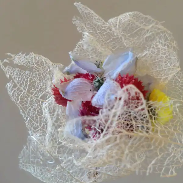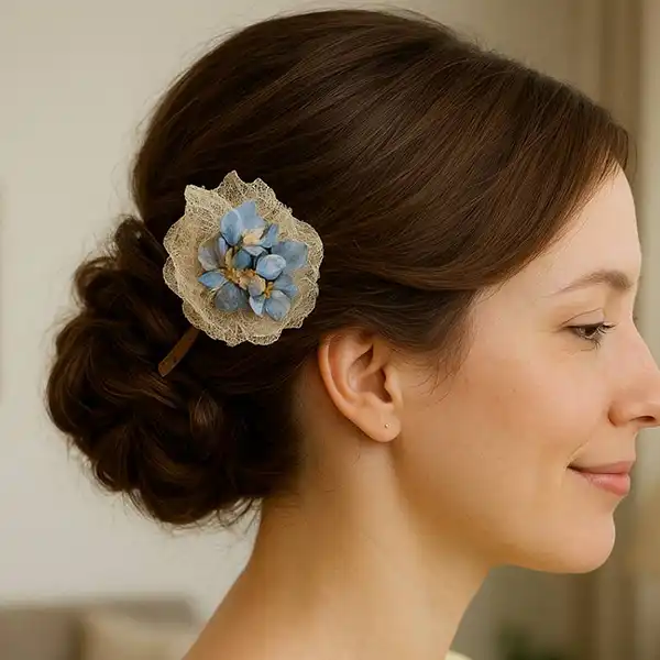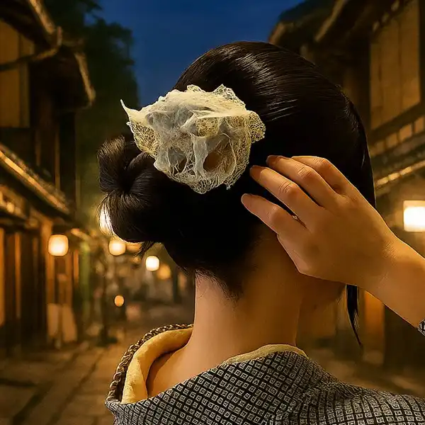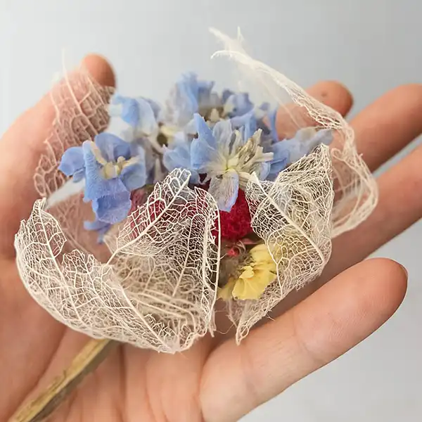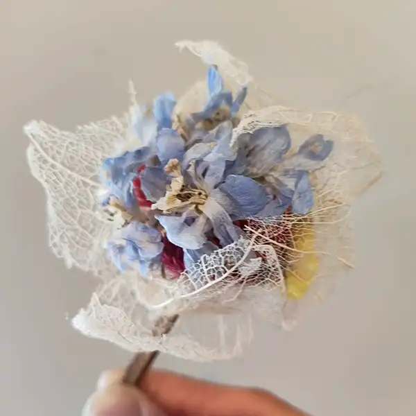 This is a dried flower hair accessory in the style of a traditional Japanese kanzashi. At its base is a manually bleached hozuki (Chinese lantern plant), complemented by a variety of seasonal blooms. Inspired by the gentle glow of a Japanese bonbori lantern, the design softly illuminates the space around it. Each skewer is carefully hand-carved from Moso bamboo, allowing you to enjoy the unique character and texture that only handmade craftsmanship can offer. Perfect for adding a subtle touch of elegance to everyday outfits or special occasions. Kanzashi is a traditional Japanese hair ornament, typically inserted into tied or styled hair. It comes in various shapes, materials, and designs, chosen to match the season or occasion, adding elegance and charm.