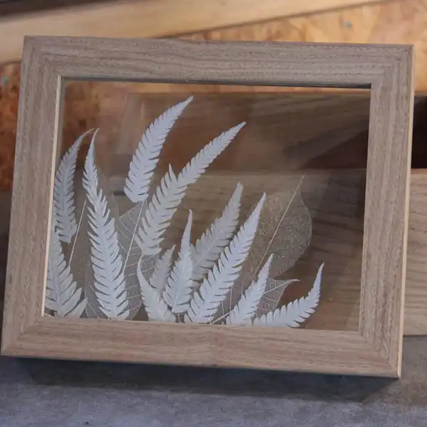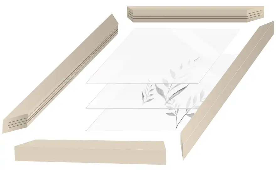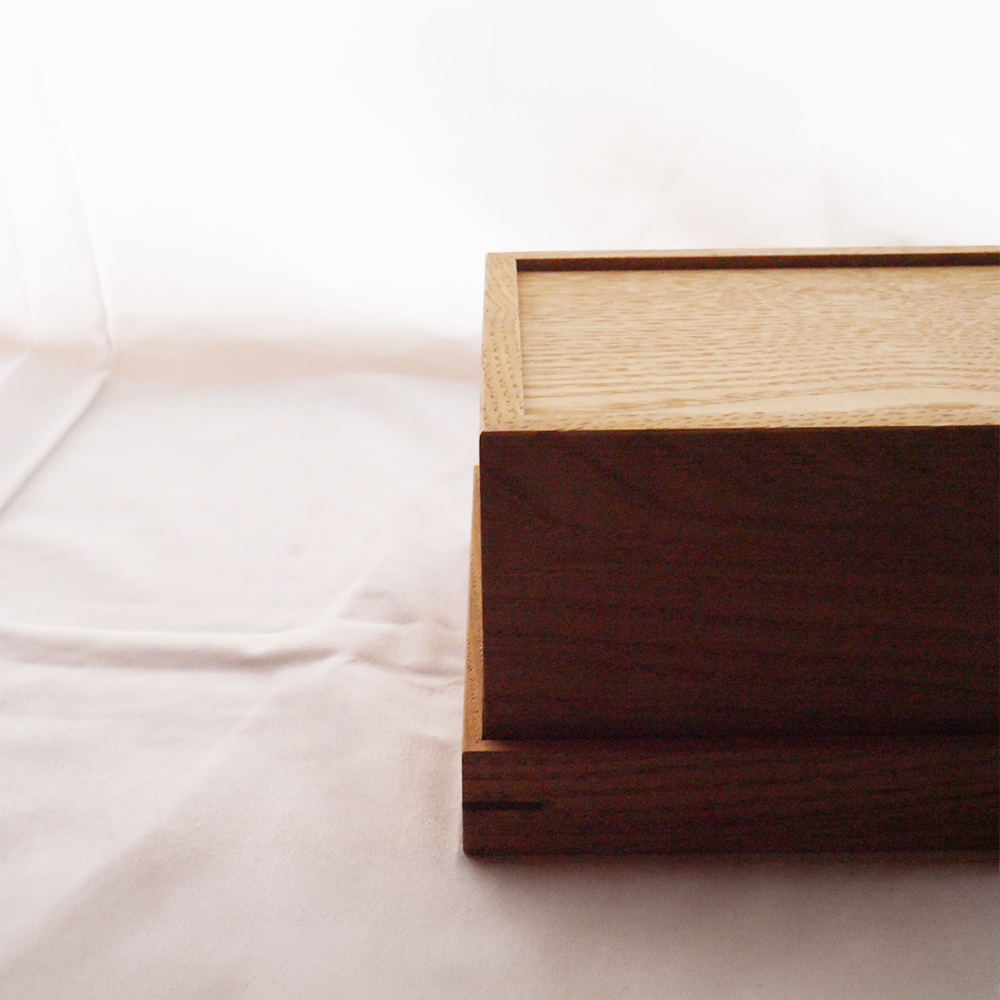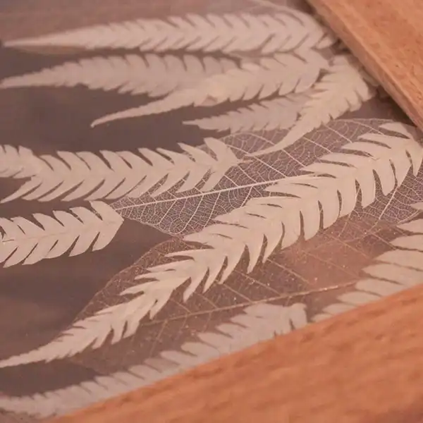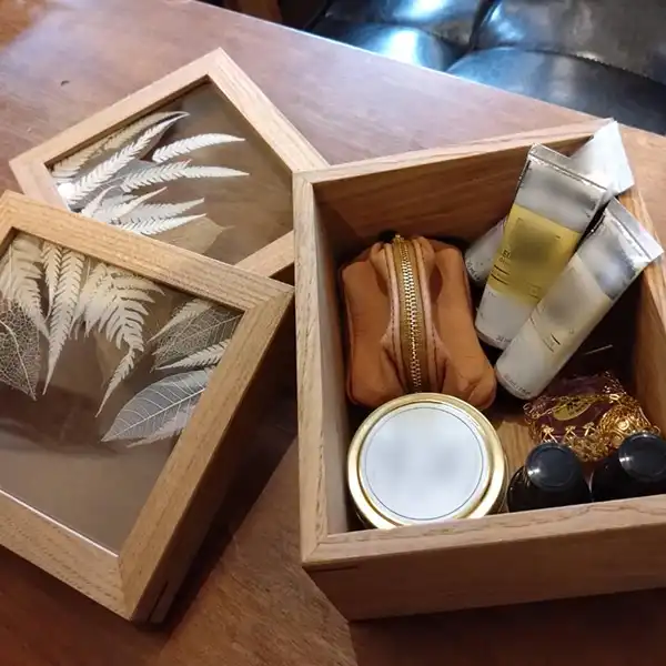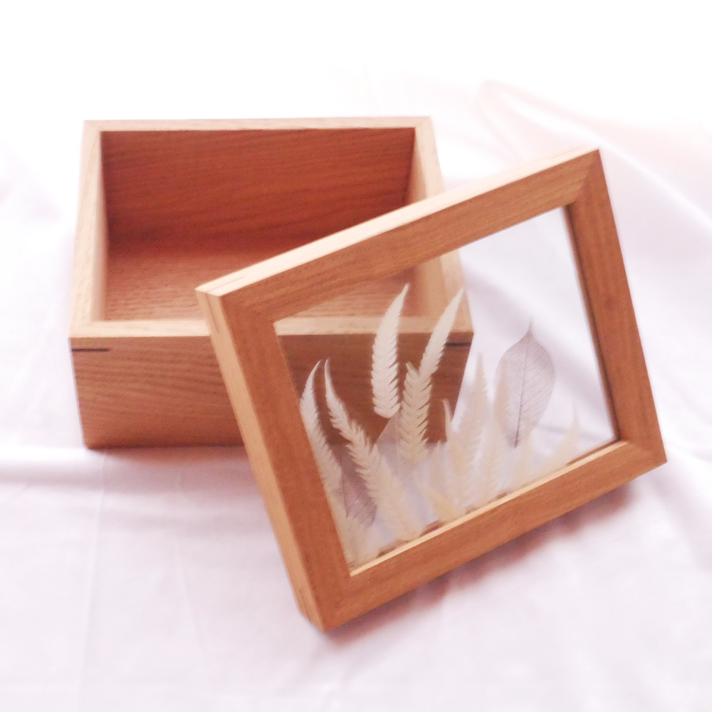 This is a wooden box for storing groceries like tea bags, small accessories, or other items around the kitchen. The top panel is made with three sheets of glass, with pressed leaf veins sandwiched between two layers. When light passes through, it creates an enchanting and dreamy scene. Additionally, the top panel can stand upright, allowing you to display it like a painting or specimen, making it a beautiful interior decor piece when left open.