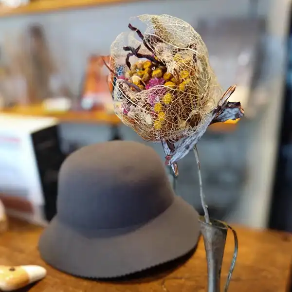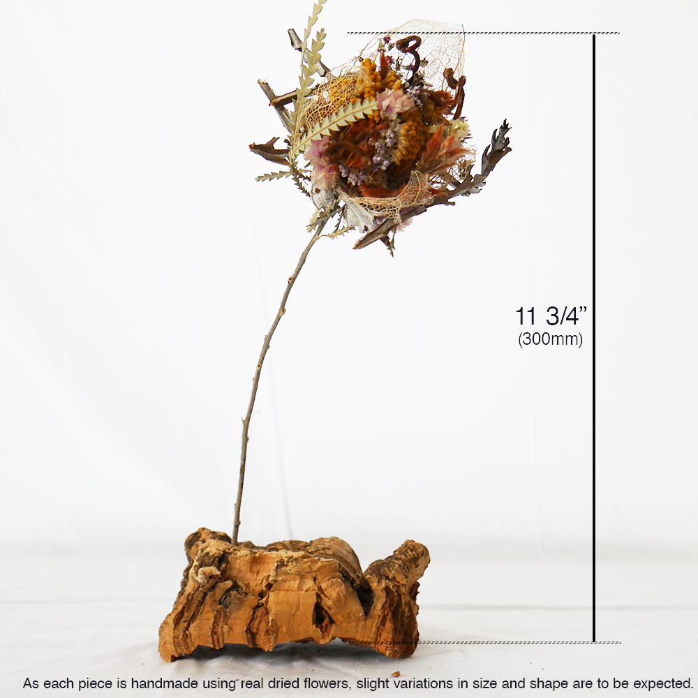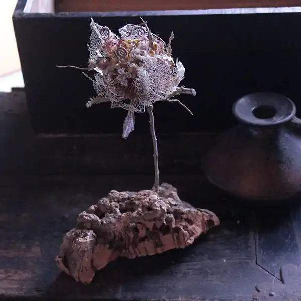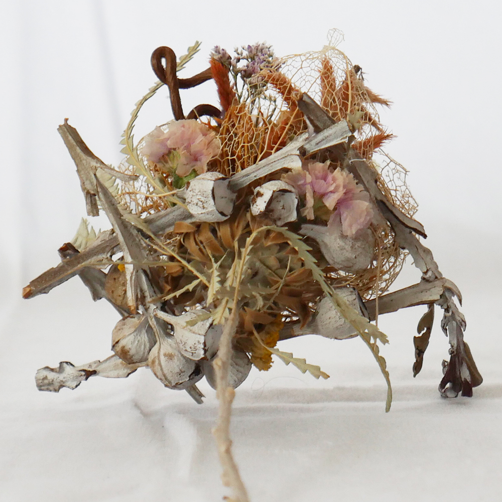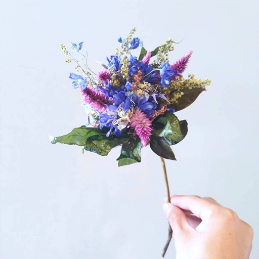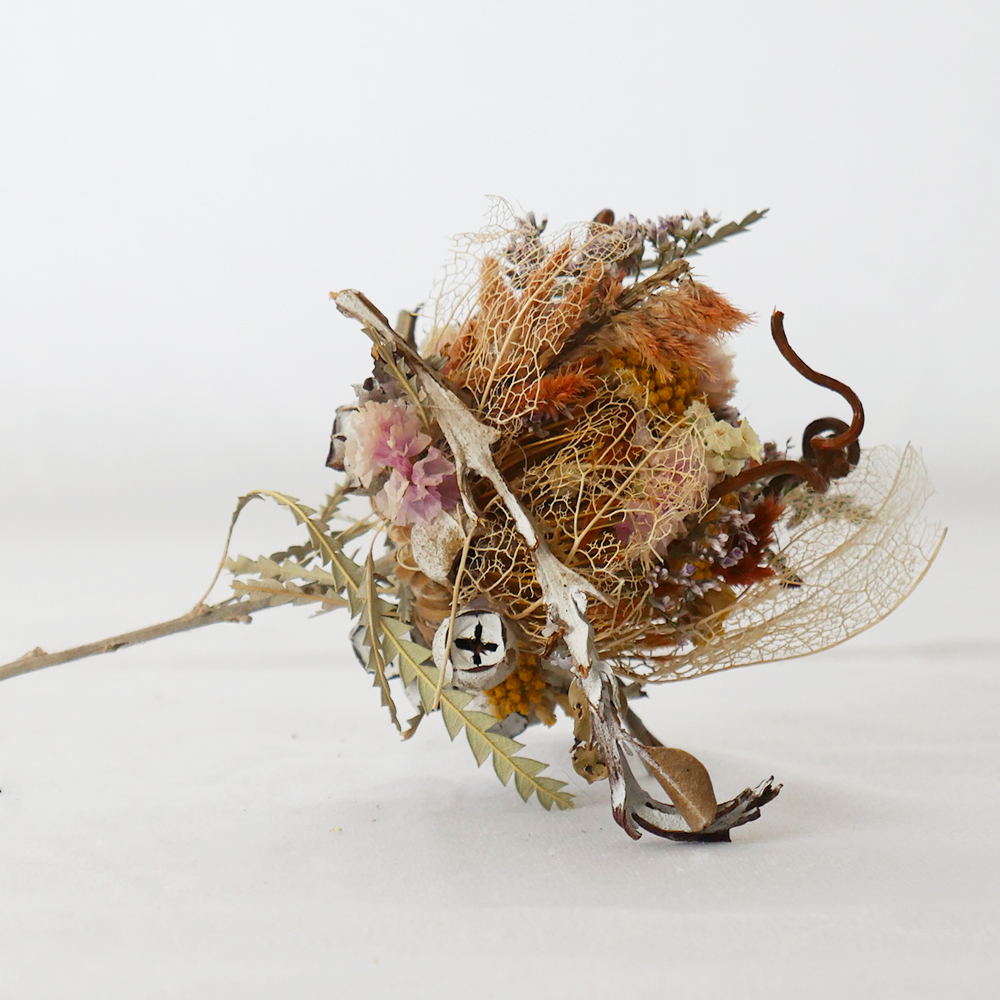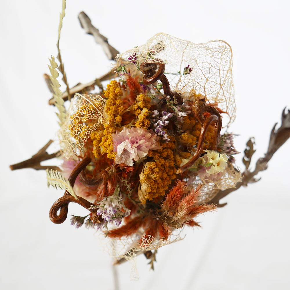 “ICHIRIN” is a series based on the concept of “Together, We Form a Single Flower.”In addition to commercially distributed flowers, we actively utilize plants and flowers labeled as pruning waste as dried flower materials.By weaving together various types of flowers and those grown in different environments, we handcraft and reconstruct them into a new single flower.
