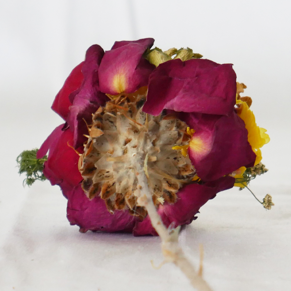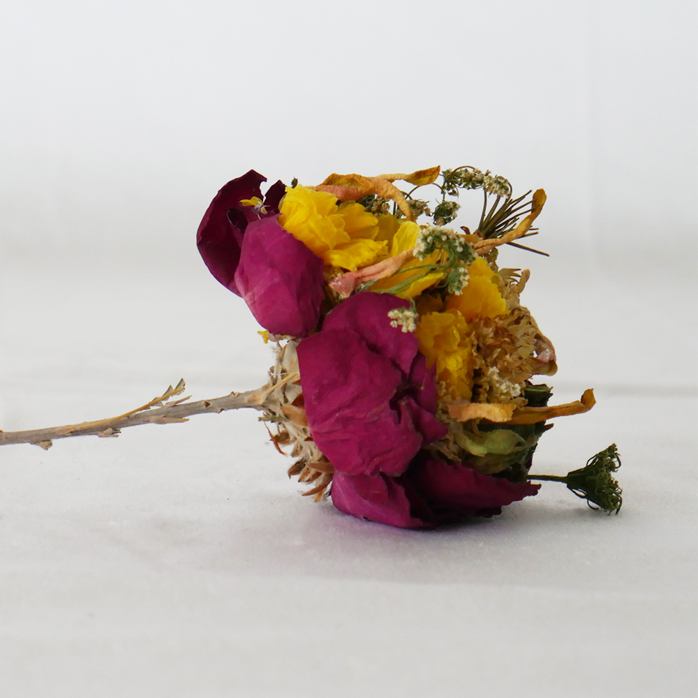“ICHIRIN” is a series based on the concept of “Together, We Form a Single Flower.” In addition to commercially distributed flowers, we actively utilize plants and flowers labeled as pruning waste as dried flower materials. By weaving together various types of flowers and those grown in different environments, we handcraft and reconstruct them into a new single flower.